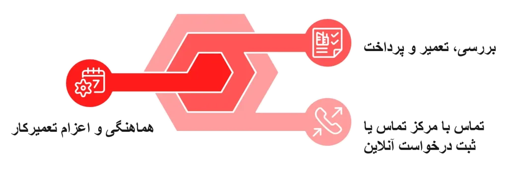 تماس با تعمیرگاه مرکزی و اعلام مدل و مشکل دستگاه از طرف شما اعزام متخصص تعمیر به همراه قطعات مورد نیاز در سریع ترین زمان ممکن به محل شما